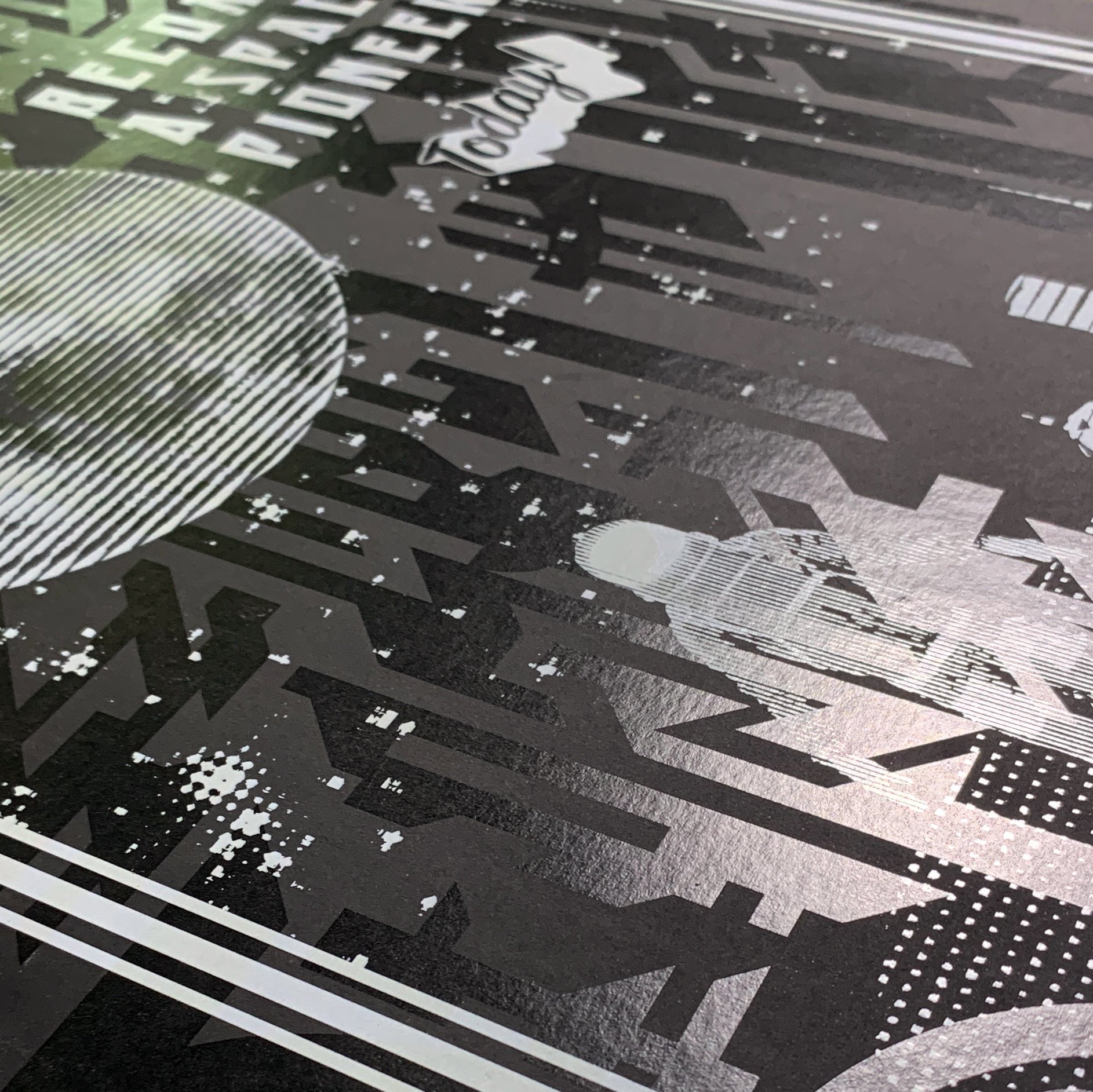 In 2019 I was one of the top 20 entries nationally for my poster "Off World." The competition was created to highlight the application of white and clear toner available on their Iridesse series of production digital printing devices. The image above is a screen representation of my poster design which is actually white and clear ink printed onto black stock.